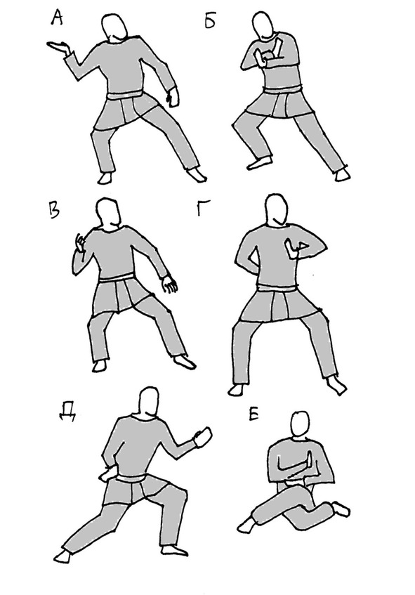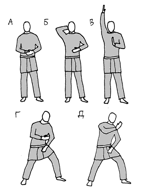 Нужно также отметить что большинство из этих положений может выполняться на различных уровнях – верхнем (опущенные по швам руки достают до бедер), среднем (руки достают до колен) и нижнем (руки касаются пола). Внезапная смена уровней служит одним из способов ухода от атак.
