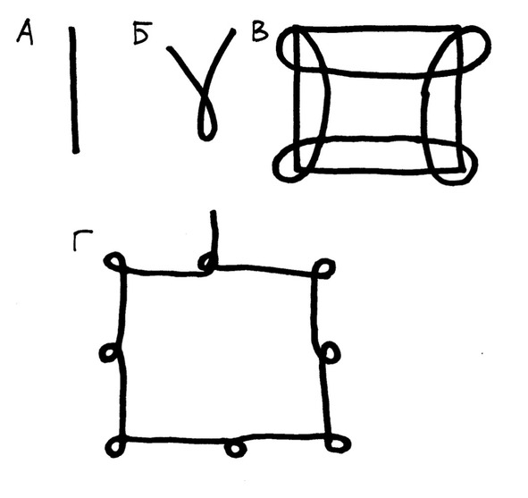 В индийской борьбе Калари-пайатту эти нарисованные геометрические фигуры называются калам [13]. Они каждый раз заново перед практикой изображаются на полу с помощью рисовой муки и имеют практическое применение. Различные комбинации движений по основным точкам этих фигур используются для тренировки перемещений в различных направлениях. В силате перемещения по таким геометрическим фигурам называют лангка, вместо обычных передвижений по прямой, характерных для всех современных боевых искусств. Помимо тренировки шагов эти диаграммы имеют еще и метафизическое значение, будучи геометрическими символами (янтра). Так, прямая (Рисунок 5а) символизирует Шиву (лингам, мужское начало), петля (Рисунок. 5б) символизирует Шакти (йони, женское начало), их сочетание открывает доступ к силе. На рис. 5в изображен один из вариантов прохождения по квадрату, применяемом в Калари-пайатту и силате.