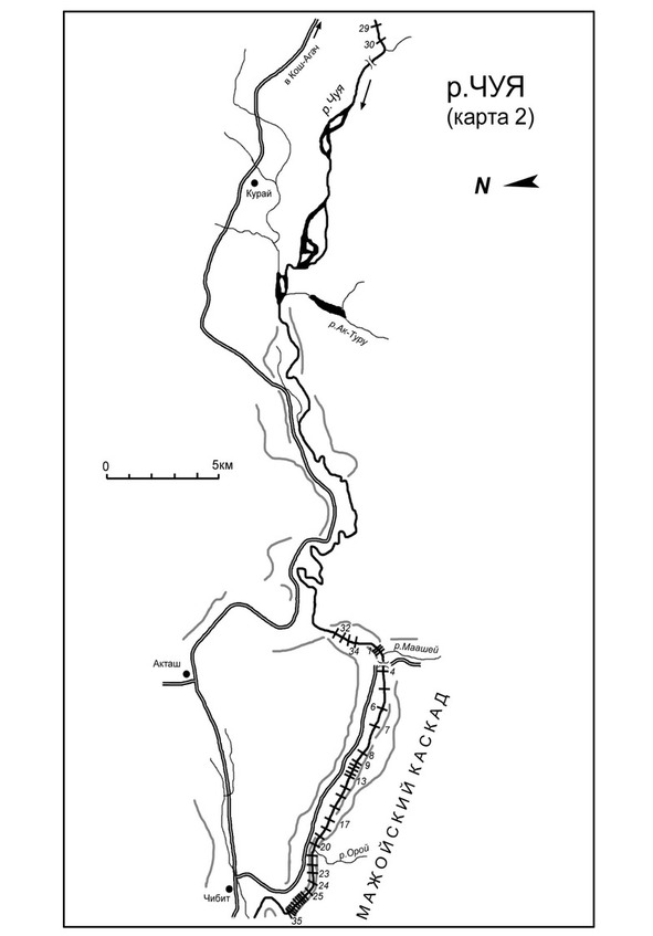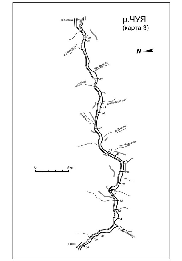 55км – 2. Участок от с. Чаган-Узун до моста через Чую. Длина 50 км. Уклон 5 м/км. Пороги 1 – 30 от 1 до 3 кат. сложности. Расход 70 – 80 куб. м/сек.