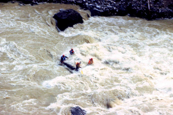 После перекуса идем на разведку полуторакилометрового участка безымянных шивер 13—15. В нашу дико высокую воду эти безымянные препятствия явно приобрели «шестерочный» характер. После долгих дебатов пошли. Очень сложная линия движения. Эдик не хочет брать на себя ответственность и поэтому судно веду я. После долгого крутежа в пороге, заходим в ключевое место очень точно. Здесь ушли вправо от огромной бочки. Еще 300м достаточно нервного сплава и, наконец, чалка. Стоим под высоченной осыпью на страховке. Через час пришел Рамыч со своей командой. У них был позыв на «киль» в бочке. Стоим, ждем Кат-3. Мы страхуем с воды, ребята Рамыча спасконцами. Меня колотит легкий мандраж: Кат-3 шел сегодня достаточно неуверенно. А любая авария здесь очень чревата. Нам надо поймать все и всех до «Гарнитура», иначе они уйдут в «Президиум», а там каюк. Наконец, выскакивает из-за поворота Кат-3. Все в порядке. Вытаскиваем «кати» из воды на крохотную полочку, а сами по сыпухе выбираемся из каньона.