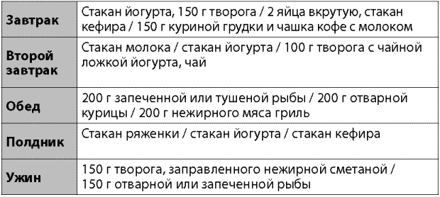 В белковые дни разрешается употреблять в пищу нежирное мясо, рыбу, яйца, кефир, обезжиренные молоко и ряженку, нежирный творог и твердый сыр. Возможное меню белковых дней может состоять из таких продуктов (табл. 4).