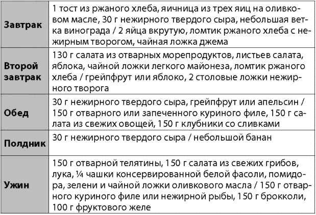 Бритни запретила себе гамбургеры, картофель, сахар, лимонад и алкоголь. Регулярно и небольшими порциями она ела мясо, птицу, рыбу, яйца, дикий рис, морковь, капусту и салат (табл. 7). Ее суточная норма не превышала 1200 ккал: 30 % составляли ненасыщенные жиры, 30 % – белки, а 40 % – углеводы. Ужинала звезда не позже чем за три часа до сна.