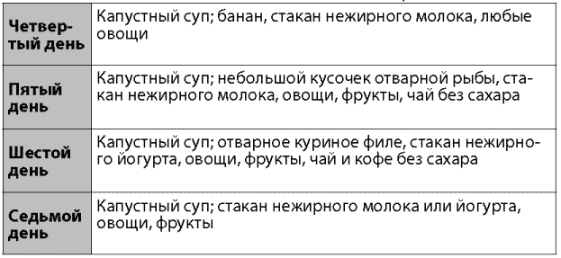 При желании в суп можно добавить ? стакана отварного риса. Данная диета рассчитана на неделю, питание дробное, до 6 раз в день. Во время перекусов можно употреблять любые фрукты, кроме бананов, винограда и инжира. Как источник животного белка рекомендуется использовать нежирные йогурты и молоко. Овощи можно есть любые.