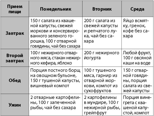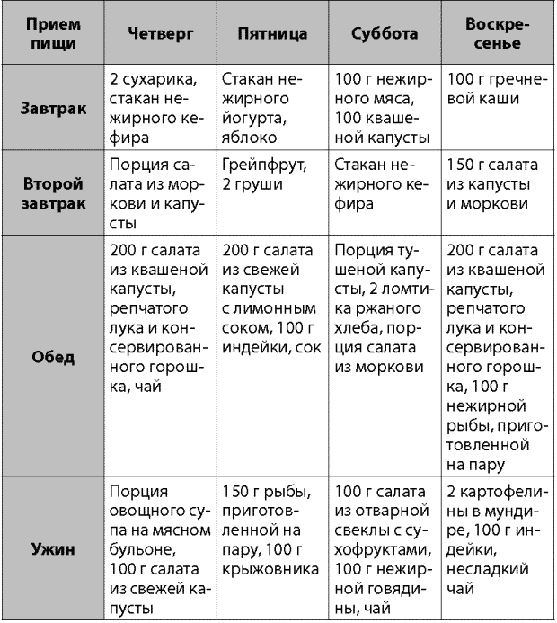 Предлагаемая система питания была разработана для восстановления пациентов в послеоперационный период. Ее широко стали применять в конце XX века. Существует несколько вариантов капустной диеты, но один из самых эффективных – недельный (табл. 21).