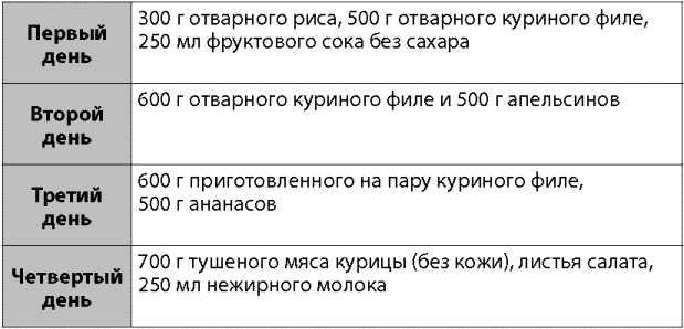 Желающие избавиться от лишнего всего за три дня могут попробовать очень жесткую, но действенную монодиету на курином мясе. Во время ее соблюдения за день нужно съедать до 700 г отварного филе, разделенного на несколько приемов пищи. Также разрешается пить травяной чай и обычную воду. Спиртные напитки, газировка и фруктовые соки из рациона полностью исключаются. Дольше трех дней соблюдать эту монодиету не рекомендуется, поскольку она не является сбалансированной.