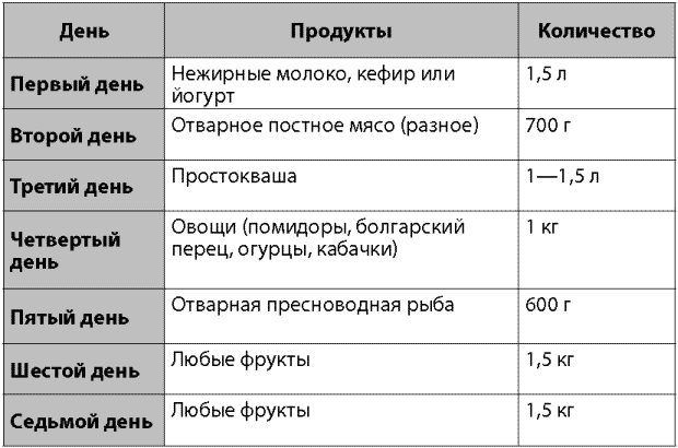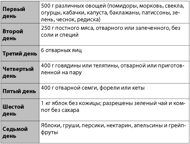 Несмотря на разнообразное меню, пестрая диета требует не только четкого выполнения всех предписаний, но и ограничения физической активности. Нельзя допускать недосыпания и чрезвычайно интенсивных нагрузок. Также придется исключить любые напитки, кроме минеральной воды без газа, которой, чтобы добиться хороших результатов, нужно употреблять хотя бы 2 л в день. В вечернее время можно позволить себе стакан несладкого зеленого чая с мятой. Меню пестрой диеты на неделю (табл. 25) отличается строгостью; соль, масло и специи желательно не использовать; питание дробное (до 6 раз в день).