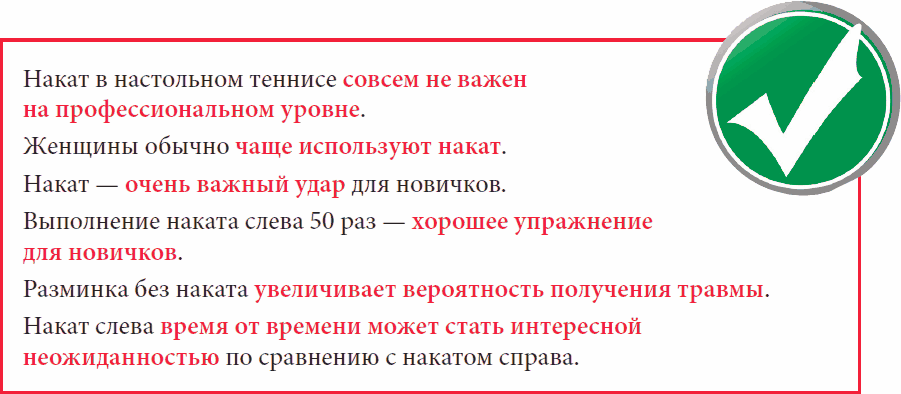 Быстрый накат, или накат с движением запястья, требует постоянной тренировки. Поэтому на начальном уровне достаточно наката слева без двигательного движения.