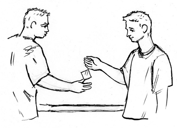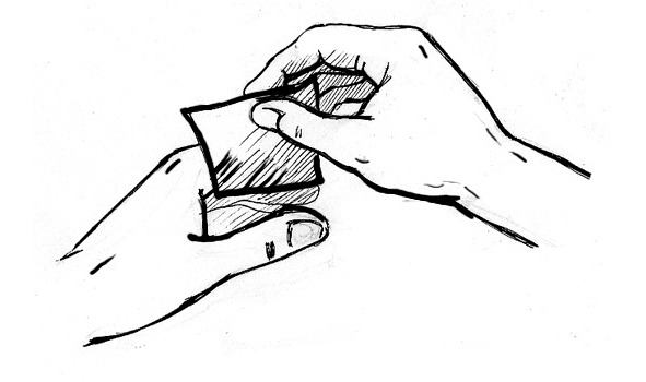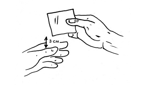 Все это хорошо, но какого черта?! Какое это все имеет отношение к бою?!? – спросит нетерпеливый читатель. Еще минуточку терпения. Предлагаю вам провести простой эксперимент (все упражнения, которые непосредственно связанны с техникой каратэ, находятся в разделе, посвященном методике наших тренировок): берем листик бумаги 10х10 см, новую денежную купюру и т. д. Едва касаясь (т.е. с усилием, необходимым лишь для того, чтобы листок не упал) чистыми и сухими указательным и большим пальцами, держим его. При этом листик расположен по середине, между 4-мя и большим пальцами на высоте приблизительно 3—5 см. Затем, держащий листок должен его просто отпустить, не прикладывая никаких дополнительных усилий. (рис. 3.1—3.4) Задача второго участника – поймать листик кистью.