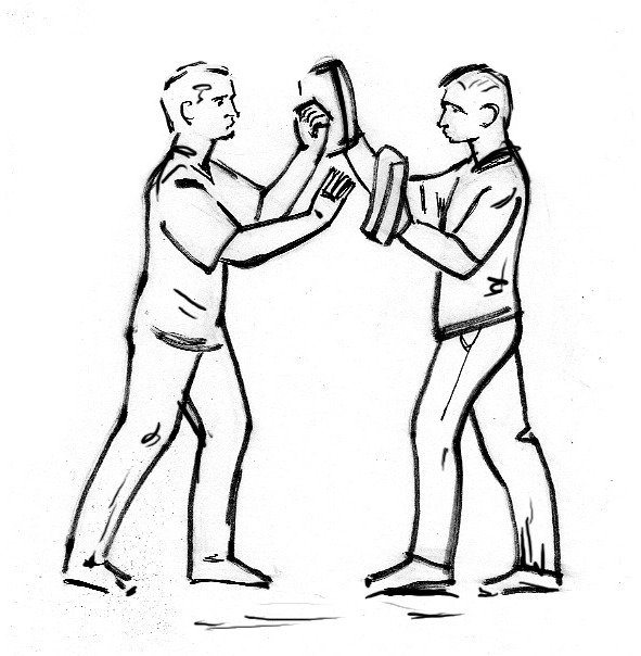 Первое упражнение. Один партнер одевает две «лапы», и быстрыми, но плавными движениями, в «рваном» ритме водит ими в зоне досягаемости рук второго. Задача последнего каждый раз кимировать (т.е. прикладывать силу) в лапу тем или иным ударом. (рис.3.5)