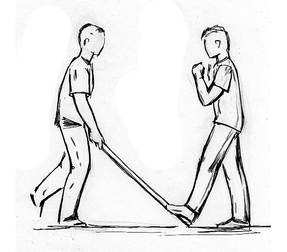 Третье упражнение. Один партнер, легко держа дзё за один конец, ведет другим концом по полу в «свободном рисунке». Задача второго – наступить на палку. (Внимание! Не допускайте отклонение плеч назад. Данное упражнение – имитация наступания на ноги, а не детских качелей.) (рис.3.7)