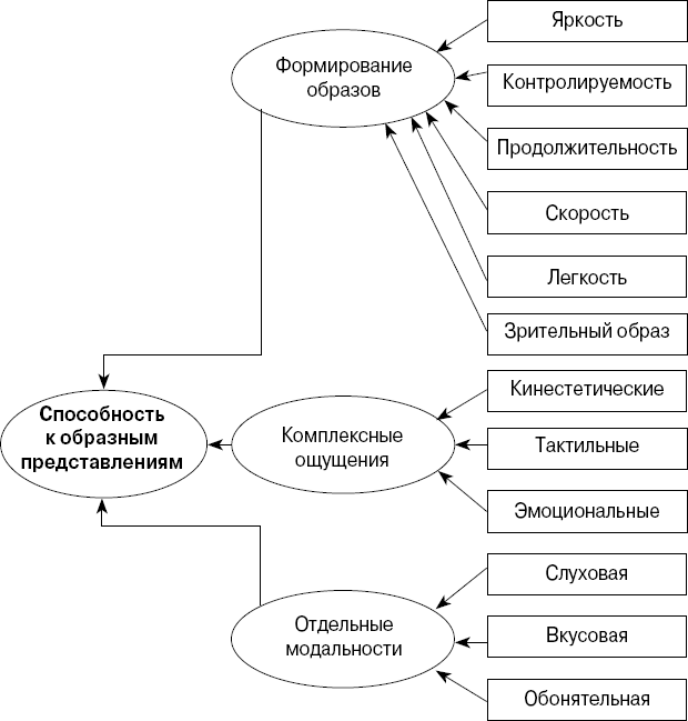 Содержание модели раскрывается посредством трехуровневой структуры (рис. 5): на общий фактор «способности к образным представлениям» оказывают свое влияние факторы второго уровня – формирования образов, комплексных ощущений и отдельных модальностей, на которые, в свою очередь, влияют рассматриваемые на третьем уровне индивидуальные пространственные, сенсорные и эмоциональные характеристики образов.