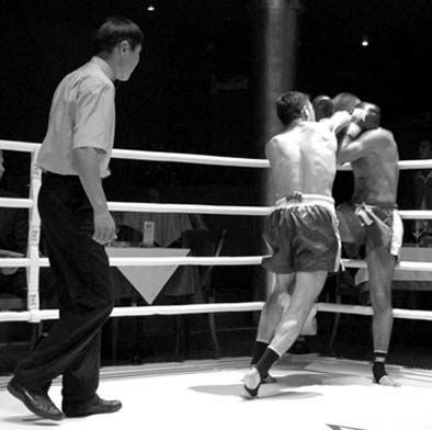 При нанесении рубящего удара правым локтем вначале выполняется мощное вращательно-поступательное движение туловища влево с последующим переносом веса тела с правой ноги на левую.