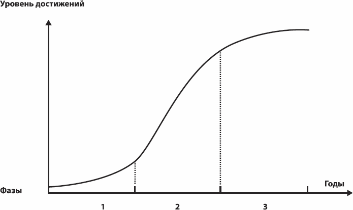 Безусловно, эти процессы и явления стимулируют рост спортивных достижений и предъявляют все возрастающие требования к их реализации. Вместе с тем научные исследования свидетельствуют, что в общих чертах динамику роста спортивных достижений в любом виде спорта можно описать в виде логистической кривой (рис. 4.2). Эта кривая состоит из трех фаз, каждая из которых имеет свои особенности. В определенной мере эта кривая отражает динамику становления вида спорта, а также и индивидуальный рост мастерства спортсмена. Продолжительность отдельных фаз в разных спортивных дисциплинах различна.
