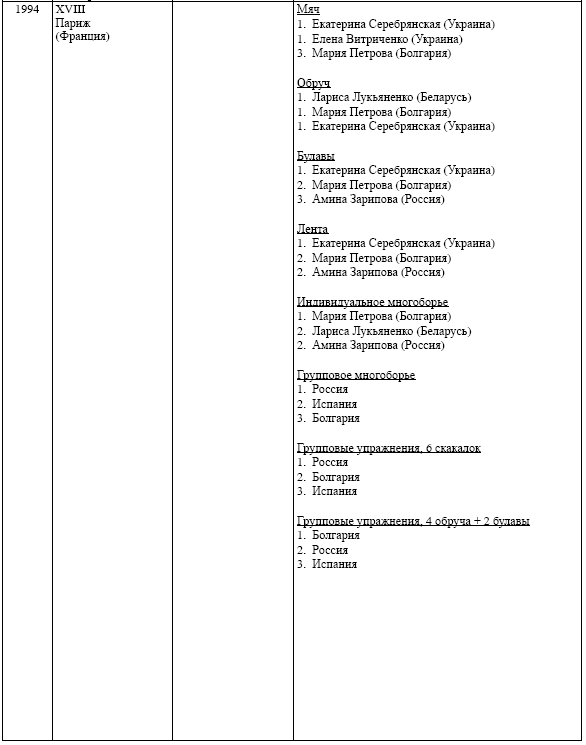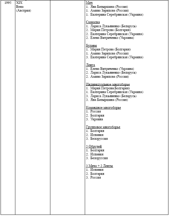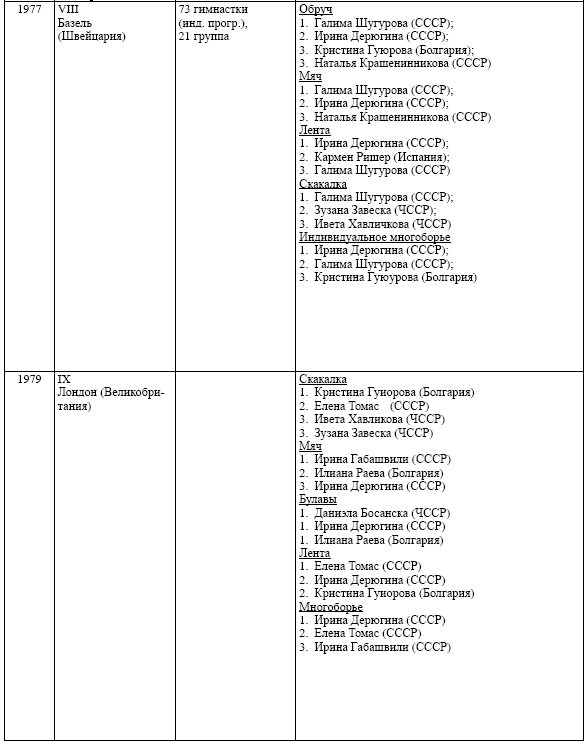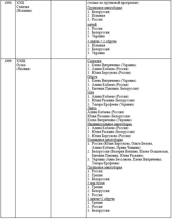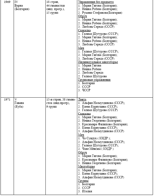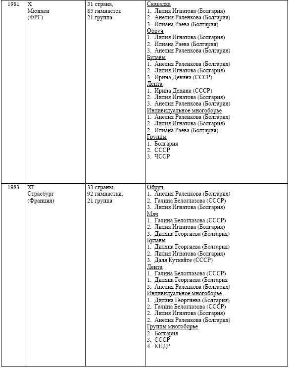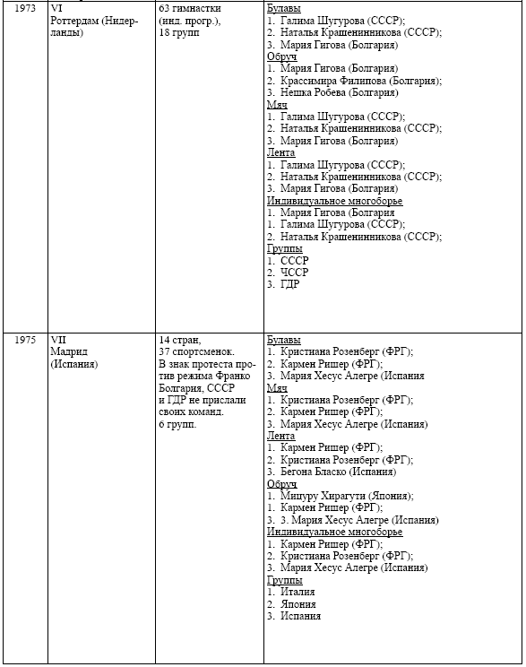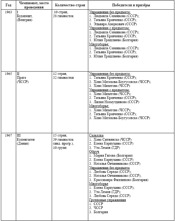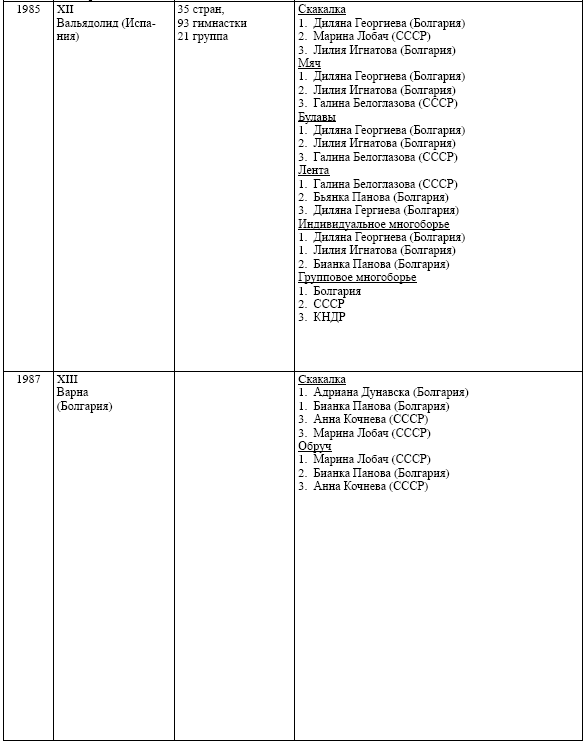 В 1967 году в мировой художественной гимнастике появились соревнования по групповым упражнениям. Первый чемпионат мира по групповым упражнениям состоялся в 1967 году в Копенгагене. Команда групповых упражнений состояла из шести гимнасток. Победили спортсменки Советского Союза. С 1987 года соревнования по групповым упражнениям стали включать два вида: первый – одинаковый предмет для всех гимнасток в команде, второй – два разных предмета. Победителями становились гимнастки: в многоборье и в каждом виде Основную конкуренцию советским гимнасткам составляли преимущественно болгарские спортсменки (таблица 1).