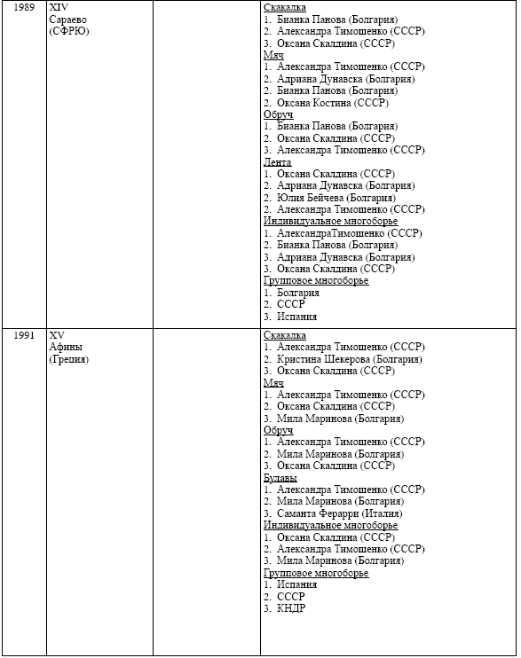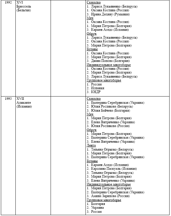 С 1963 по 1991 год чемпионаты мира по художественной гимнастике проводились один раз в два года (по нечетным годам). А по четным годам, начиная с 1978 года по 1992 год, проводились чемпионаты Европы. Первой чемпионкой Европы стала омская гимнастка Галима Шугурова. С 1992 года чемпионаты мира и Европы стали проводиться ежегодно (табл. 1).
