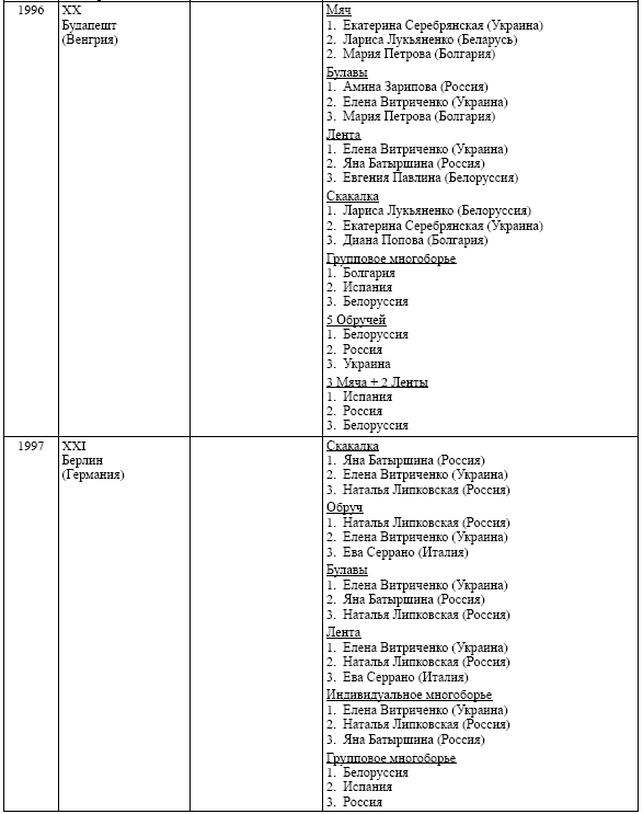 В 1996 году в Атланте на Играх XXVI Олимпиады художественная гимнастика была представлена двумя дисциплинами: соревнованиями по многоборью в индивидуальных и групповых упражнениях (таблица 2, 3). Чемпионками этих Олимпийских игр стали Екатерина Серебрянская (Украина) и испанские гимнастки групповых упражнений.
