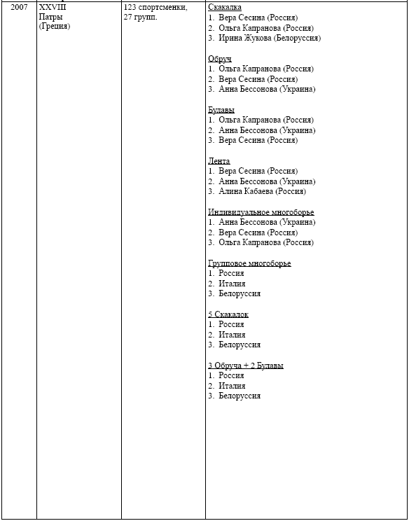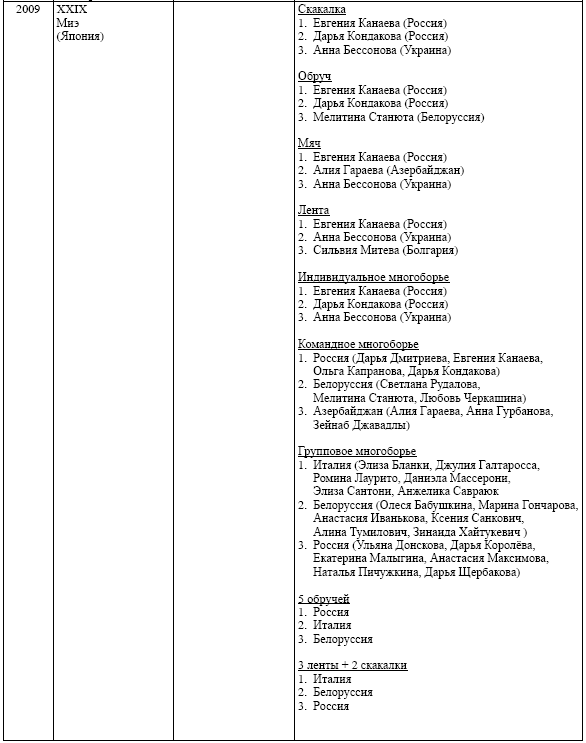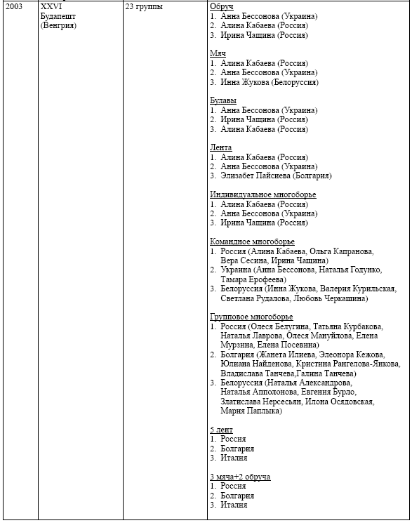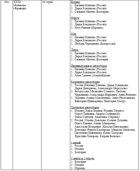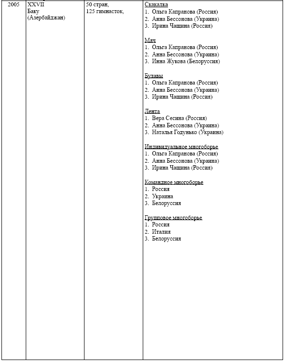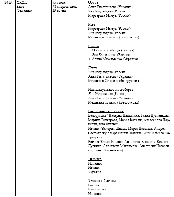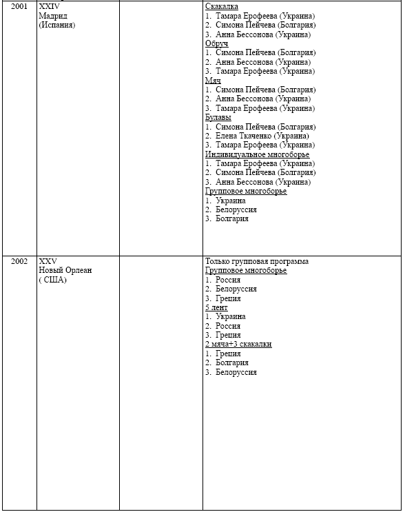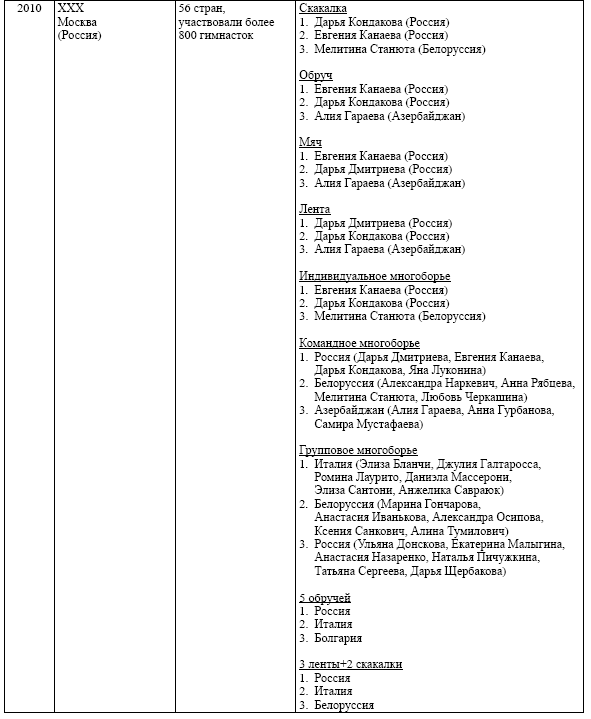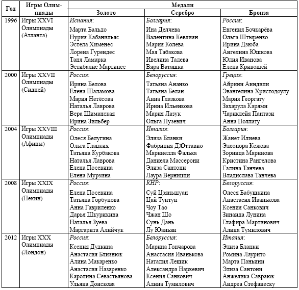 Успешное выступление российских спортсменок на Играх XXVII, XXVIII, XXIX и XXX Олимпиад свидетельствуют о том, что в нашей стране сложилась научно-обоснованная система подготовки высококвалифицированных гимнасток, которая обеспечивает удержание лидирующих позиций на мировом помосте. Огромный вклад в подготовку лидеров мировой художественной гимнастики внесли Заслуженные тренеры страны – Винер-Усманова И.А., Штельбаумс В.Е., Буянова О.В., Шумилова А.В., Шаталина В.Н., Горбулина Н.М., Янина А.Н., Иваницкая В.А., Тишина Н.Б., Карпушенко Е.Л, Зарипова А.В. и многие другие.
