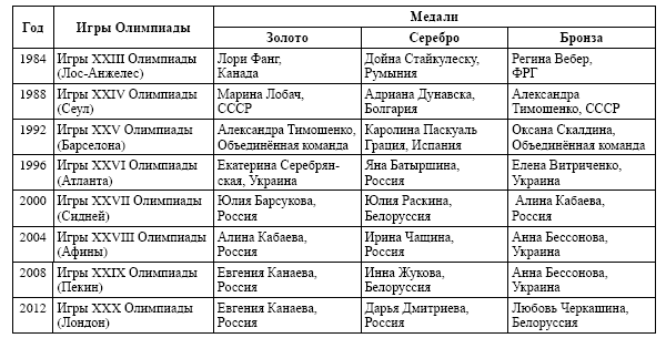 В 1984 году художественная гимнастика впервые была представлена в программе Игр XXIII Олимпиады, проходивших в Лос-Анджелесе (США). Первой олимпийской чемпионкой стала Лори Фанг из Канады. В 1988 году на Играх XXIV Олимпиады в Сеуле (Южная Корея) Олимпийской чемпионкой стала советская гимнастка Марина Лобач из Минска. В 1992 году в Барселоне (Испания) чемпионкой Игр XXV Олимпиады стала Александра Тимошенко из Киева (таблица 2).