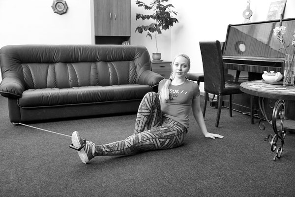 И.П. сидя боком к НОП (допускается И.П. лежа на спине), тренажер фиксируется на дальней от НОП ноге. Отведение (абдукция) рабочей ноги на выдохе «Хаа» максимально в сторону – 15–20 повторений. То же самое другой ногой (фото 3 а, б).