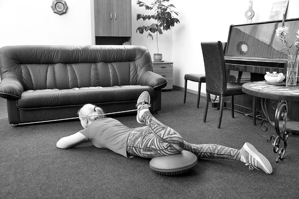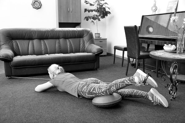 И.П. лежа на животе, передней поверхностью бедра на валике, нога согнута, другая нога на полу, головой к НОП. Один конец тренажера закреплен на нижней 1/3 голени (или стопе), другой закреплен к неподвижной опоре за нижнюю ее часть. Разгибание ноги до прямой линии. Каждой ногой по 15–20 повторений (фото 4 а, б). Упражнение можно выполнять сериями по 2–3 подхода.