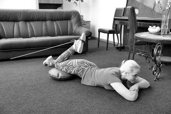 И.П. лежа передней поверхностью бедра на валике; другая нога на полу, ногами к НОП. Один конец тренажера закреплен на нижней 1/3 голени (или стопе), другой закреплен к неподвижной опоре (дверь, диван и проч.) за нижнюю ее часть. Сгибание/тяга голени к бедру. Каждой ногой по 15–20 повторений (фото 5 а, б).