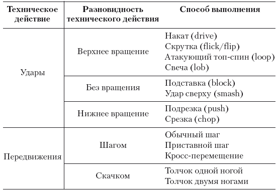 В таблице ниже представлена классификация технических действий в настольном теннисе, каждое из которых делится на разновидности, а затем по способу выполнения. Также для ударов приводим английские названия, которые вы можете встретить в иностранных спортивных источниках или на международном турнире.
