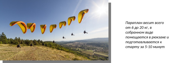 • Параплан можно подготовить к старту за 10 минут.