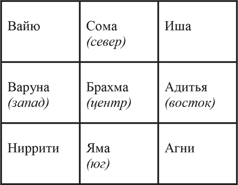 Бывая в Майсуре, я проживаю месяцами в «благоприятном» доме, поэтому прекрасно представляю, как он устроен. По васту, квадрат служит основой бытия, ибо энергии лучше всего сбалансированы в квадратной форме. На дом воздействуют два вида космических энергий: праника – энергия планирования и джайвика – энергия воплощения. Вектор праники направлен от Солнца к Земле, поэтому его направление непрерывно меняется в течение суток, а траектории джайвики огибают поверхность Земли от северного полюса к южному. Идеальная ситуация возникает в пространстве, где силы сбалансированы, и все энергии приходят с северо-востока и уходят на юго-запад. Результат взаимодействия названных сил представлен классической схемой деления дома на девять секторов. При восстановлении энергетической структуры дома важно, чтобы каждая зона соответствовала свойствам своего бога-покровителя. Центральная часть находится под влиянием Брахмы – создателя мира, поэтому ее называют Брахмастханом. Лучше всего соорудить в центре алтарь или отвести это место для практики.