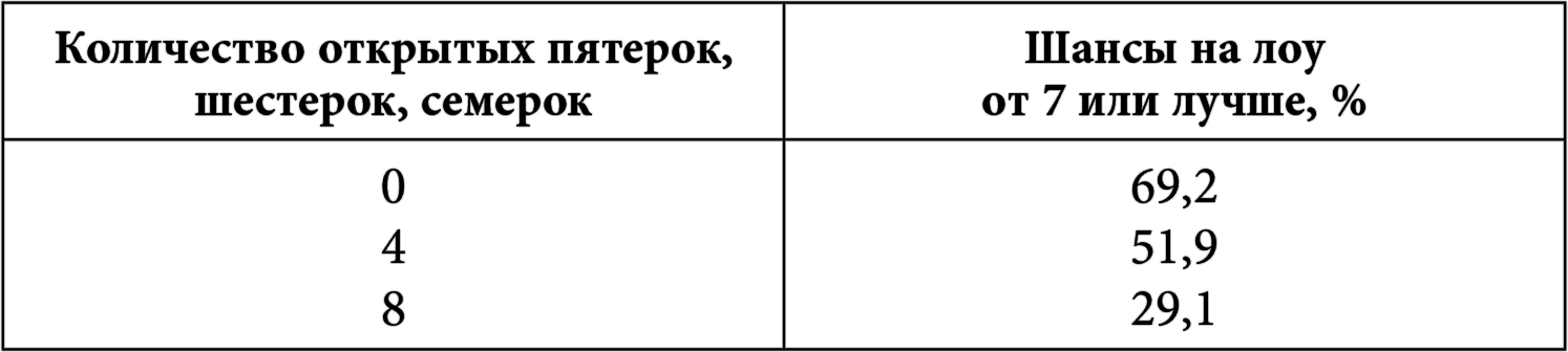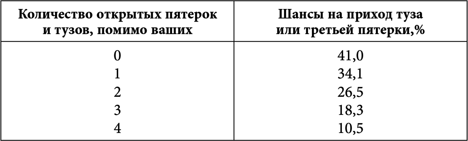 Ваши шансы улучшить руку меняются разительно в зависимости от количества требуемых карт, которые уже вышли, и от общего количества открытых карт. Второй фактор важен. Например, с тремя пиками среди ваших первых трех карт и при отсутствии открытых карт вы соберете флеш за семь карт в 18 % случаев. Теперь предположим, что вы видите: один из семерых оппонентов показывает пику. Как это влияет на ваши шансы собрать флеш? Если вы скажете, что это повышает их, вы правы. Верно, что одна из требуемых карт вышла, но то же касается и семи карт, которые вам не требуются. Таким образом, пик стало относительно больше в сравнении с ситуацией, когда вы совсем не видели карт своих соперников.
