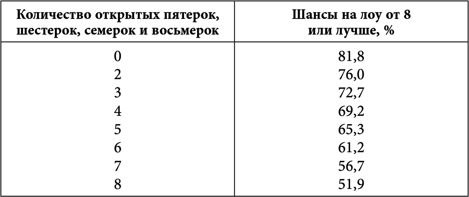 У вас отличные шансы собрать лоу от 8 или лучше, даже если среди 10 открытых карт восемь будут уменьшать ваши шансы. Но отметьте, насколько сложнее собрать лоу от 7.