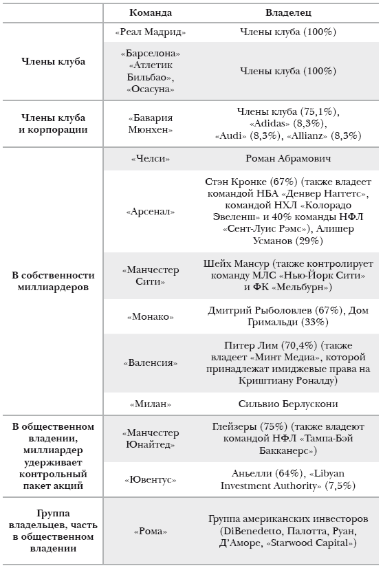 Такое различие между клубами в организации структуры собственности привело к появлению финансовых преимуществ у одних и затруднений у других. К примеру, покупка «Челси» и «Манчестер Сити» миллиардерами привела к росту конкуренции и цен на талантливых игроков, что влияет на такие клубы, как «Реал Мадрид». Недавно «Ванда Групп» – огромный китайский конгломерат, принадлежащий миллиардеру Ван Цзяньлиню, – приобрел 20 % акций «Атлетико Мадрид» за 45 миллионов евро, что позволило ему войти в совет директоров клуба. Теперь «Атлетико» имеет больше средств для подписания талантливых игроков.
