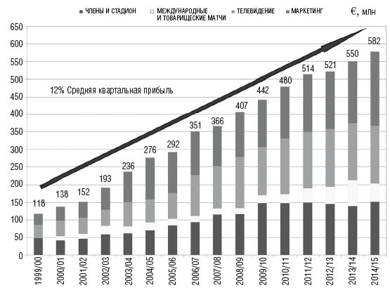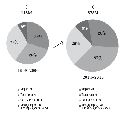 В 2000 году членские взносы и продажа билетов составляли 32 % от общего дохода, доходы от продажи прав на трансляции – 33 %; это были самые крупные статьи доходов, и в сумме они составляли 65 % от общей прибыли. В сезоне 2000–2001 доход от продажи билетов составил 14 миллионов евро (13 миллионов долларов), что составило 10 % от общего дохода (138 миллионов евро, 126 миллионов долларов). Суммарный доход от стадиона (билеты, сезонные абонементы членов клуба, VIP-ложи, конференц-залы, музеи, экскурсии) составил 42 миллиона евро (38 миллионов долларов, 30 % от общего дохода). По итогам сезона 2013–2014 доходы от продажи билетов составили лишь 5 % от суммарного дохода. Как видно из диаграмм на следующей странице, в 2015 году доходы от продажи билетов и членских взносов составили 26 % от суммарного дохода. Крупнейшим источником доходов является маркетинг, включающий спонсорские соглашения, – эта статья принесла 37 % от общего количества доходов, увеличившись с 26 % в 2000 году. Доходы от стадиона и членских взносов в сумме с доходами от продаж прав на трансляции составили 54 % от общей прибыли. В заключение, доходы от международных и товарищеских игр составили 9 % от общего уровня доходов.