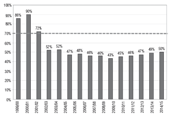 Операционная прибыль (в %) по итогам сезонов 1999–2000 и 2014–2015