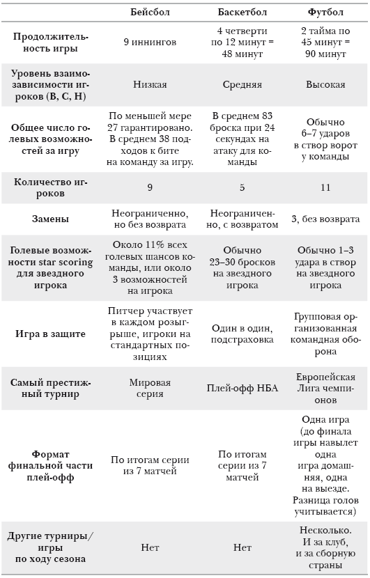 Бейсбол сильно отличается от баскетбола или футбола, так как для этой игры не требуется настолько отточенной слаженности командных действий – например, эффект «избытка звезд» (с. 228) не влияет негативно на игру бейсбольной команды. Существуют и другие различия и нюансы при сравнении бейсбольной команды (и использования концепции «moneyball») с баскетбольной или футбольной, причем не только как команд, но и как организаций. Сложность и взаимозависимость игроков в футболе, в отличие от бейсбола, накладывает большую ответственность на руководство при создании атмосферы, благоприятной командной работе. Пристальный разбор дает понять, насколько результативность зависит от слаженной игры всей команды – значительней, чем в баскетболе, и намного значительней, чем в бейсболе. Учитывая ограниченное количество голевых возможностей в футболе, очевидно, что командное взаимодействие является жизненно необходимым для достижения побед, как и в бизнесе.
