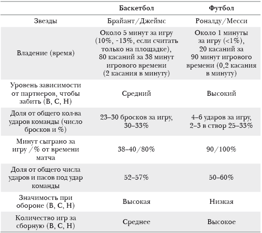 Из этих 4–6 ударов, которые наносят Роналду и Месси, половина попадает в створ ворот; половина из ударов в створ (то есть 25 % от общего числа ударов) становятся голами, что невероятно много по сравнению с другими футбольными звездами. Роналду и Месси вовлечены в 50–60 % ударов своей команды, если учитывать передачи под удар, эти показатели идентичны показателям Джеймса и Брайанта в НБА. Однако влияние Роналду и Месси на игру команды в защите более ограничено. Поэтому, даже имея в составе таких звездных игроков, как эти двое, взаимодействие на поле должно быть исключительно отточенным и слаженным, намного более тесным, чем в бейсбольных и даже баскетбольных командах. К тому же величие звезд баскетбола Брайанта и Джеймса не идет ни в какое сравнение с величием Месси и Роналду. Они лидируют с большим отрывом во всех бомбардирских рейтингах. Не важно, кто из них лучше, статистический анализ данных показывает, что они значительно лучше любого другого футболиста. Приз лучшему игроку года по версии ФИФА «Золотой мяч» с 2008 года выигрывал либо Роналду, либо Месси. В НБА, в отличие от футбола, нет двух игроков, которые бы признавались лучшим игроком года или показывали запредельно высокие результаты на протяжении 7 лет[51]. Если исключить влияние Месси и Роналду, футбол превращается в игру, в которой взаимодействие между игроками намного более развито, чем даже в баскетболе.