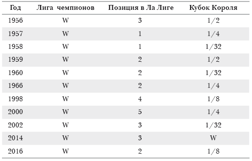 «Реал Мадрид» широко известен благодаря победам в Кубке чемпионов, но я проанализировал выступление клуба в Ла Лиге на предмет возможной корреляции с успехами в Европе, чтобы получить более полную картину выступлений клуба. Только дважды, в 1957 и 1958 годах, «Реал Мадрид» завоевал титул Ла Лиги и Кубок чемпионов в одном сезоне. Кстати, последние четыре победы «Реала» в Лиге чемпионов сопровождались третьим или более низким местом в Ла Лиге. Лишь в 2014 году «Реал Мадрид» сумел завоевать и Лигу чемпионов, и Кубок Короля за один сезон.