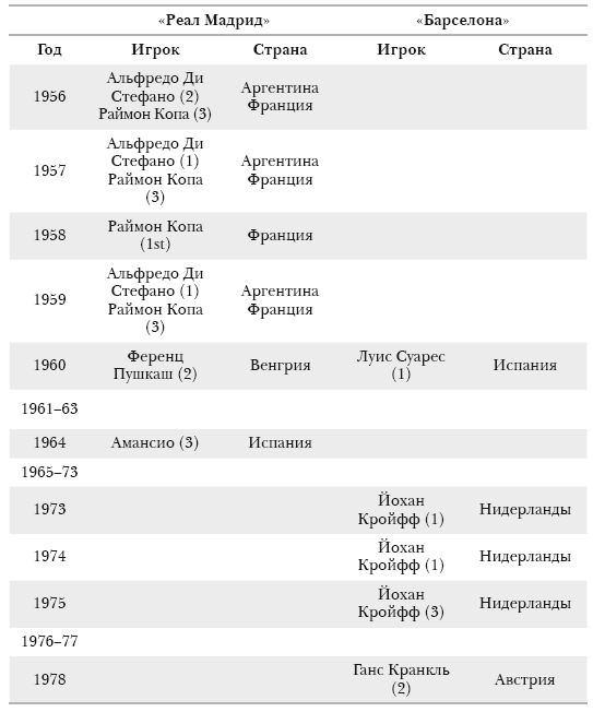 Итак, несмотря на пять побед «Реала» подряд в Кубке европейских чемпионов (с 1955–1956 по 1959–1960 годы), другие команды в конце концов настигли его. «Реал Мадрид» выиграл еще один Кубок чемпионов в 1960-х; тогда в его составе играли одни испанцы, трое из которых были выпускниками академии. После этого клуб не выигрывал Кубок чемпионов/Лигу чемпионов до конца 1990-х. Упадок его становится очевидным, если посмотреть, сколько игроков «Реала» и «Барселоны» номинировались на Золотой мяч[72]. С 1956 по 1960 год футболисты «Реала» входили восемь раз в тройку претендентов на «Золотой мяч»: Ди Стефано (1956, 1957 и 1959), Копа (1956–1959) и Пушкаш (1960); игрок «Барселоны» за тот же период в тройке оказался только один раз (Луизито, 1960). Ни один из номинантов «Реала» не был испанцем. За следующие 17 лет, с 1961 по 1978 год, игрок «Реала» попал в тройку номинантов лишь раз (испанец Аманисио Амаро, 1964), а «Барселону» представляли четырежды (1973–1975, 1978).