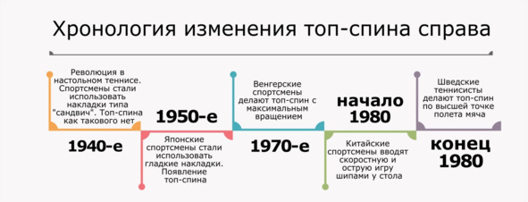 Эта хронология изменения удара, на наш взгляд важна, чтобы понимать как мир настольного тенниса пришел к современному топ-спину справа, который теперь является важнейшей, неотъемлемой частью технического арсенала любого уважающего себя теннисиста.