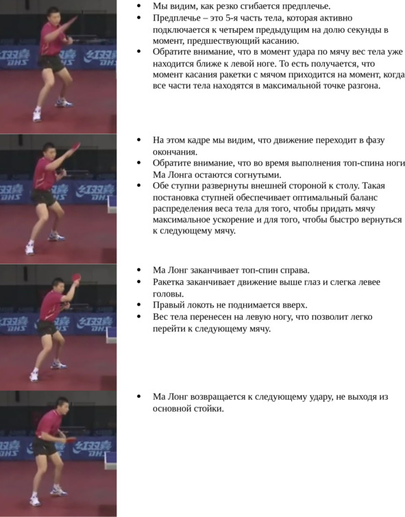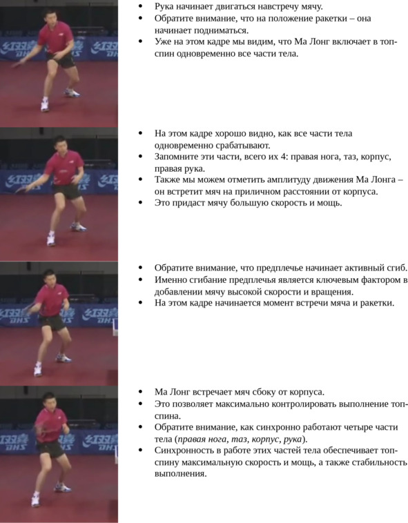 Это классический топ-спин, базовое исполнение которого изучается на самых первых этапах в обучении технике настольного тенниса. Можно сказать, что с этой вариации все и начинается. Не овладев ею в достаточной мере, вы не сможете овладеть другими. Даже не стоит пытаться. Это все равно, что учиться бегать, не научившись ходить. Всему свой черед.