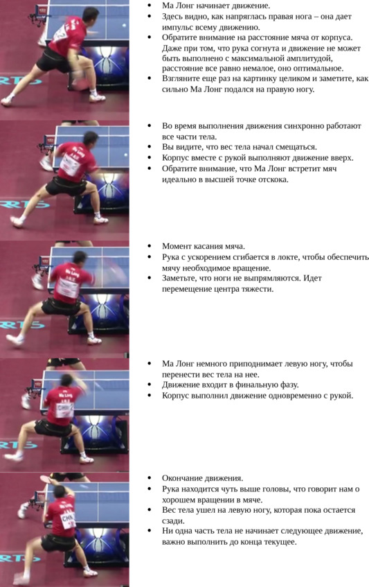 При этом обратите внимание на следующие технические приемы: если при топ-спине с подрезки мы включаем в движение и ноги и таз, и корпус, то при выполнении топ-спина по вылетающему мячу всю основную работу выполняют предплечье и кисть. Мы думаем, вы понимаете, что делая полшага вперед правой ногой, вы лишаетесь возможности полноценного движения, но при выполнении этого элемента это и не надо.