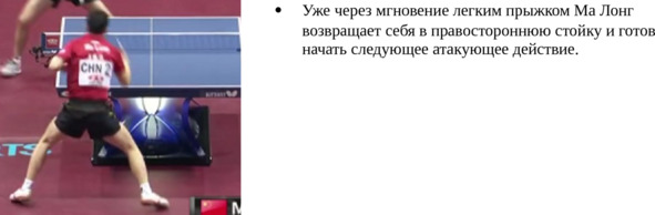 Основным нюансом выполнения топ-спина по такому мячу является постановка ног. Если при топ-спине с обычной подрезки мы ставим левую ногу чуть впереди правой, то здесь – все наоборот. Мы делаем полшага вперед правой ногой и только после этого выполняем топ-спин.