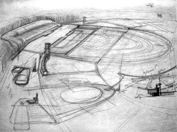 Ил. 1. Михаил Коржев. Проект Международного Красного стадиона. Ок. 1925. Карандашный рисунок. Ок. 40 ? 26 см. Государственный музей архитектуры имени А. В. Щусева. Фонд Коржева