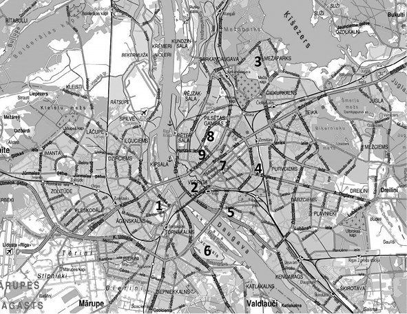 Ил. 1. План Риги, архив Андреаса Фюльберта. 1 местонахождение площади Победы (запланированной с 1936 года); 2 Старый город; 3 район Кайзервальд; 4 стадион «Даугава»; 5 Национальный спортивный манеж; 6 остров Лутсаусгольм; 7 местонахождение Дворца спорта, открытого в 1970 году; 8 Новая хоккейная арена; 9 стадион «Сконто»