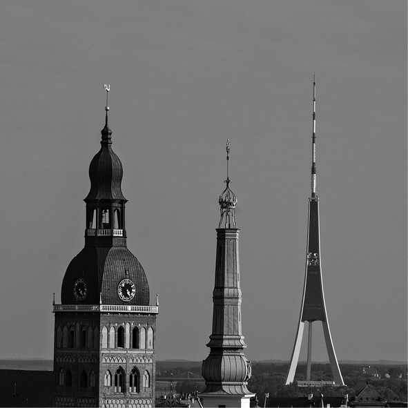 Ил. 3. Башни собора, замка и телевизионная башня (1986) в Риге, Заячий остров (Хазенгольм). Фото: Дитер Брюттинг