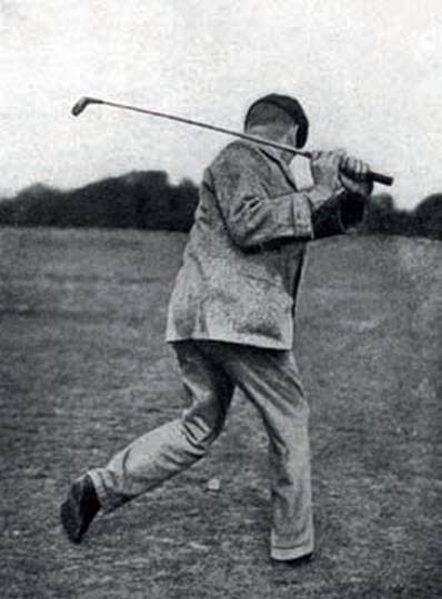 На рис. 1 видно, как закручивается гольфист для удара драйвером. Открытая, совершенно свободная от всякого напряжения стойка. Ноги прямые, плечи уже чуть развернуты в сторону цели, что позволяет свободно работать всей правой стороне тела. Такой бэксвинг сегодня просто высмеяли бы. Уверен, что современные тренеры в такой стойке насчитали бы не менее трех-четырех серьезных ошибок. А игроки того времени били гуттаперчевые мячи далеко и прямо.