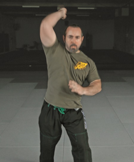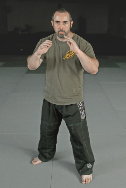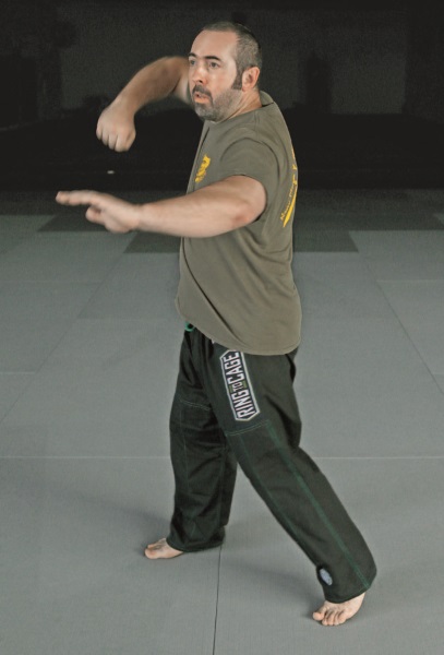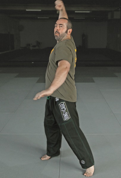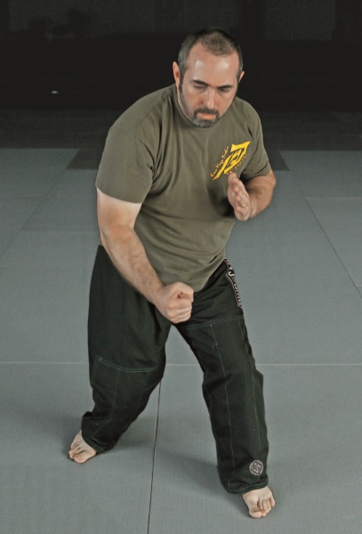 В жизненных ситуациях нет времени принимать так называемую «боевую стойку». Пытаясь это сделать, вы потеряете время и дадите агрессору возможность знать о своих намерениях. Однако для отработки ударов кулаком-молотом и понимания, как они работают, такая стойка – хорошая позиция для начала. В реальности «боевая стойка» – это положение тела, отвечающее определенным принципам: вес распределяется 50/50 между ступнями, голова над плечами, плечи над бедрами, ступни на противоположных углах прямоугольника и т.д.