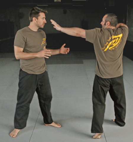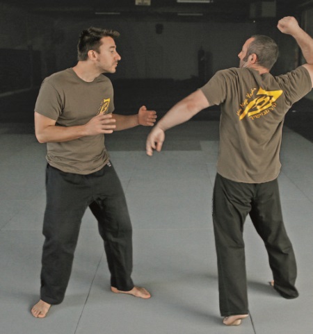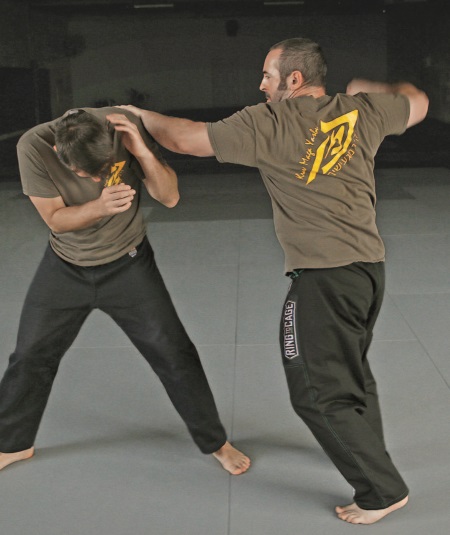 Левой рукой можно делать: удар в глаз,удар «вилкой» в горло или использовать руку для определения расстояния перед следующим ударом. Продвиньте заднюю ногу вперед, чтобы быть готовыми сделать шаг вперед во время последующего удара кулаком-молотом.