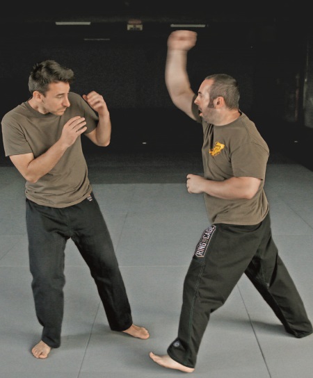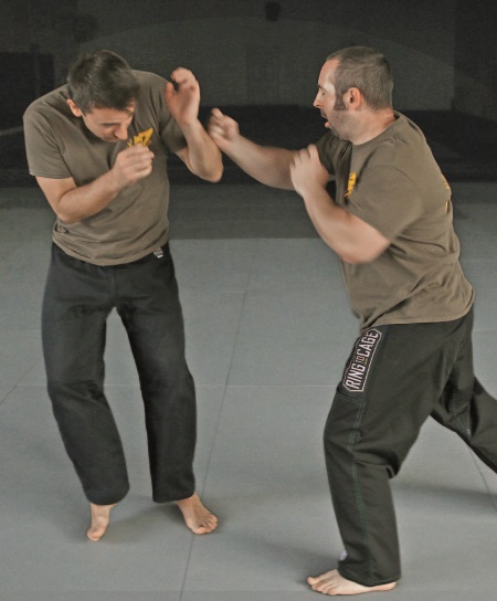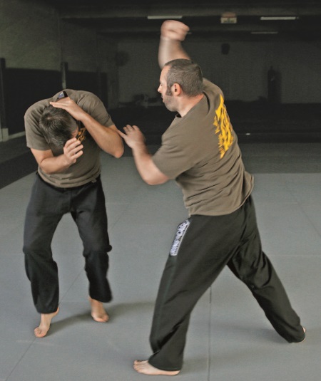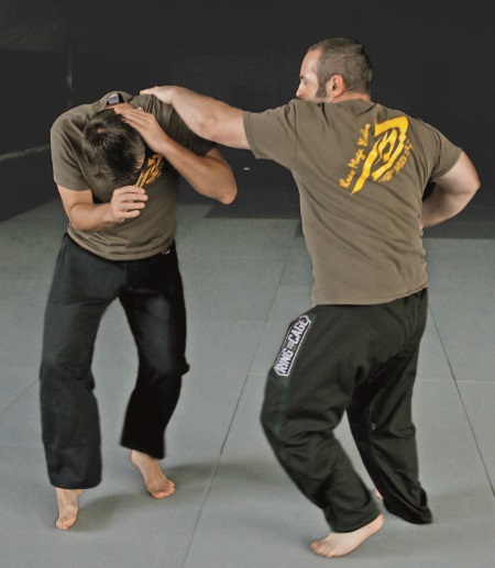 Этот процесс можно повторять снова и снова. Необязательно чередовать каждый кулак-молот с ударом в глаз/горло. Возможно, более эффективным будет нанести несколько ударов кулаком-молотом, а удар в глаз/горло использовать, только чтобы оттолкнуть противника, если этого не происходит во время нанесения ударов кулаком-молотом и есть опасность оказаться заблокированным. Как только почувствуете, что это безопасно, – разъединяйтесь. Если вы заканчиваете, загнав противника к стене и т.п., когда у него нет путей для отхода, он будет вынужден вернуться к бою с вами. Долго оставаться в такой позиции, атакуя противника, редко является хорошей идеей.