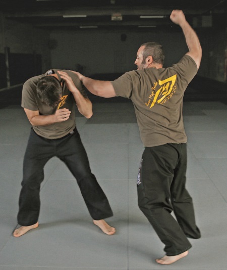 Удары в глаз хороши в качестве первоначальных ударов, поскольку для их действия не требуется особенно прицеливаться или применять особую силу. К сожалению, они не несут достаточной ударной мощи, необходимой для причинения боли и нанесения повреждений нападающему, чтобы он был вынужден выйти из боя. Во время удара в глаз начинайте готовить локоть задней руки для нанесения удара кулаком-молотом.