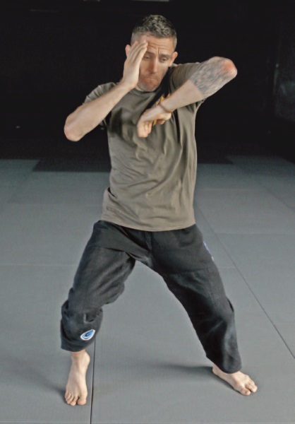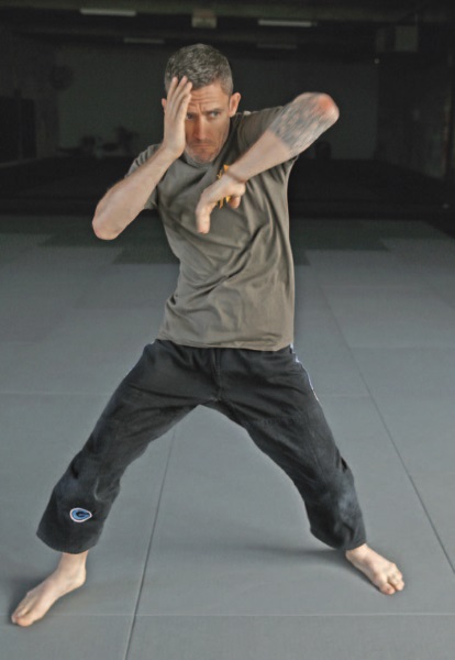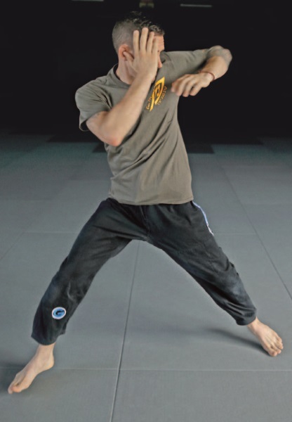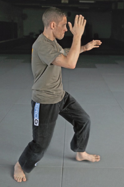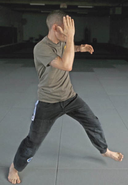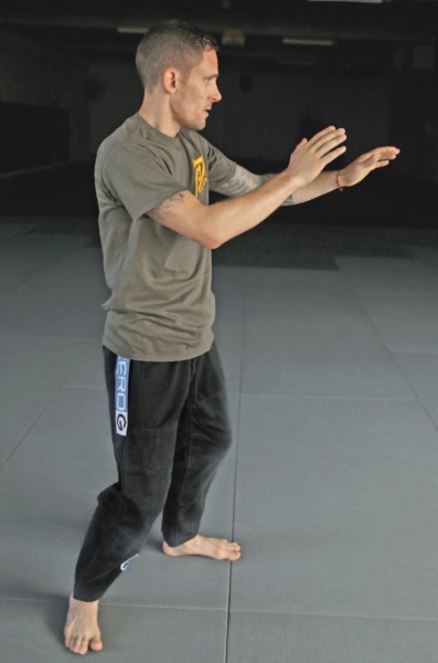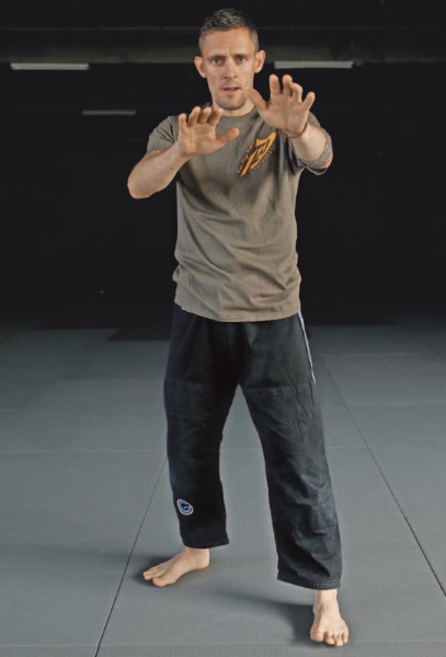 Примите позу покорности/переговоров: руки прямо перед собой, ступни на противоположных углах прямоугольника, вес распределен 50 на 50, голова над плечами, плечи над бедрами. Разумеется, этот и все другие описанные удары могут использоваться не только для первого нападения, как показано здесь, но и как часть атакующей комбинации.